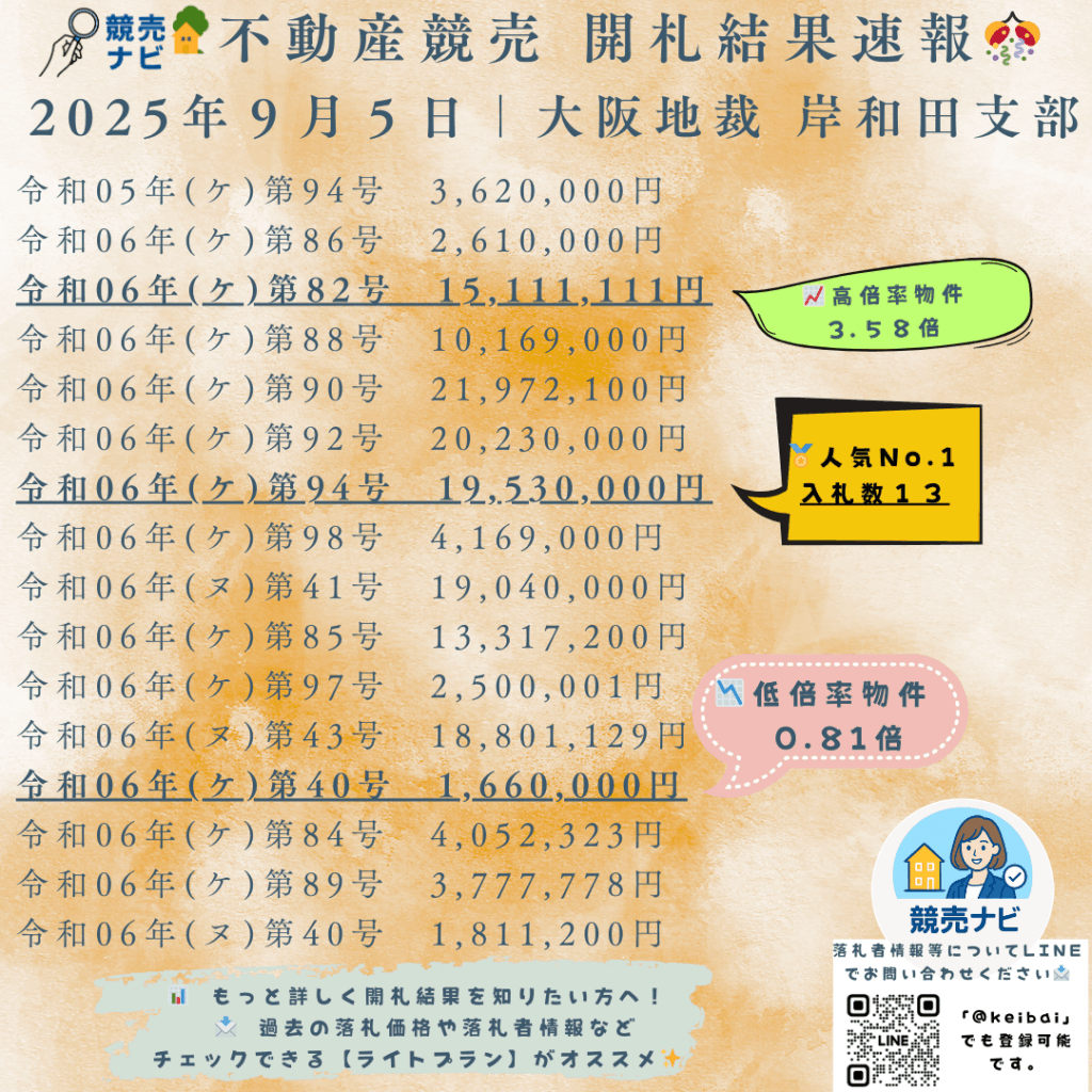 🎊【競売ナビ|開札結果速報】 📅 2025年9月5日|📍大阪地裁 岸和田支部