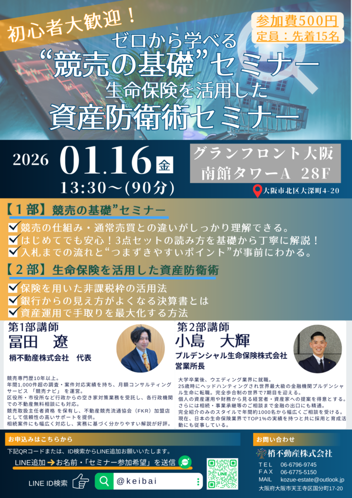 HOME // ブログ // 2026年1月16日開催 不動産競売の基礎セミナー&保険の資産防衛術セミナー